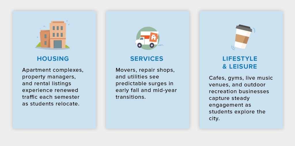 The University’s presence extends beyond student life. Academic institutions bring conferences, cultural events, and visiting families — each introducing temporary but meaningful boosts in search volume.