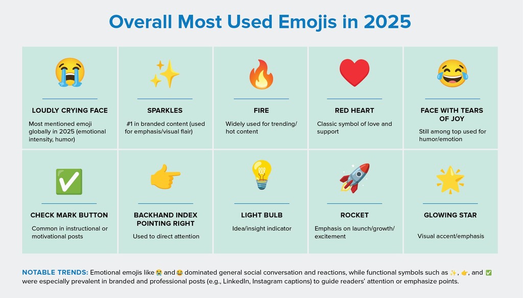 - They are used sparingly—often one emoji, not multiple